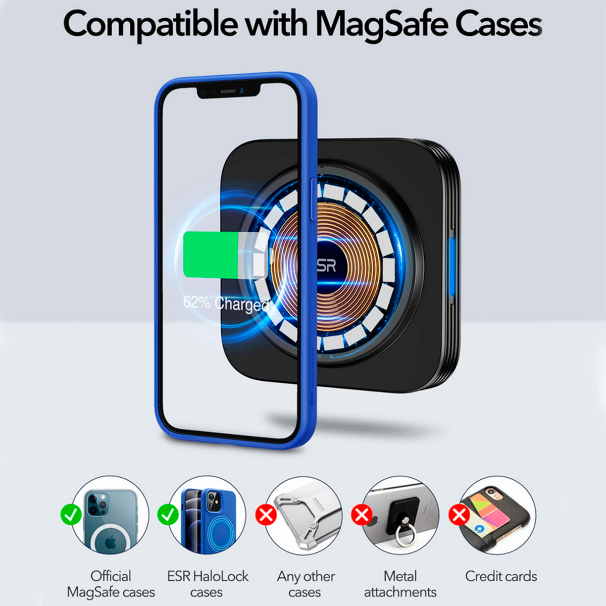 Магнітна функція MagSafe працює тільки при безпосередньому підключенні до телефону або до чохла з вбудованим магнітним вушком з додатком MagSafe.