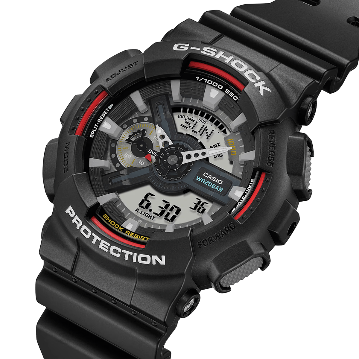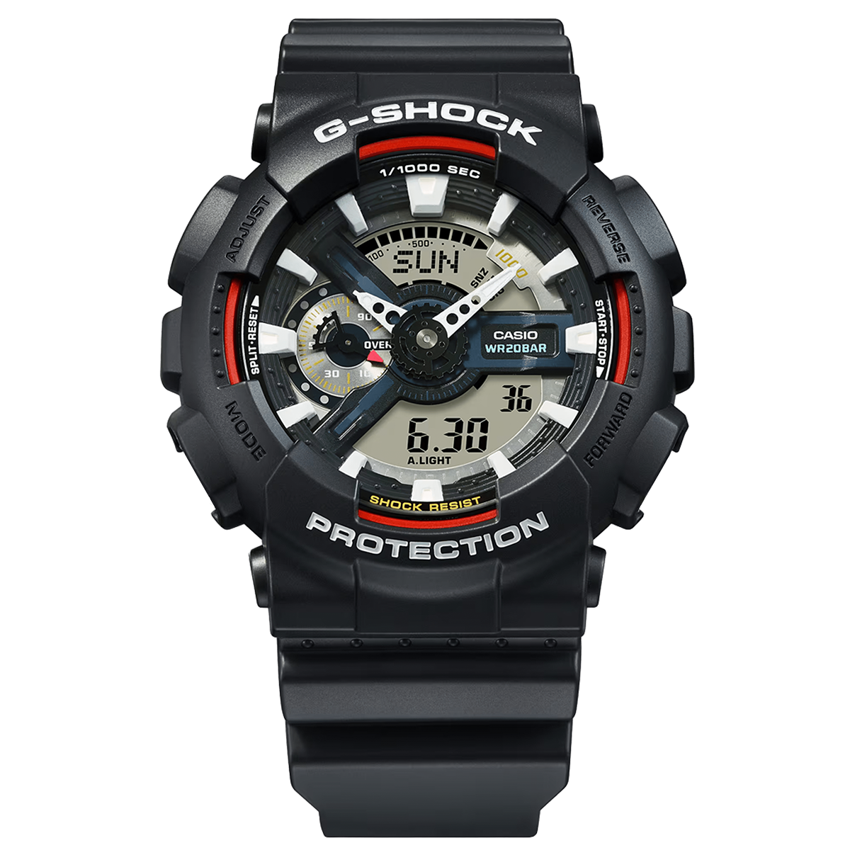 Объемный корпус и многоуровневый циферблат придают часам характер и глубину, а контрастные элементы облегчают считывание информации. Casio GA-110RL-1A удобно сидит на руке благодаря мягкому, но крепкому ремешку, что обеспечивает комфорт даже во время активного движения.
