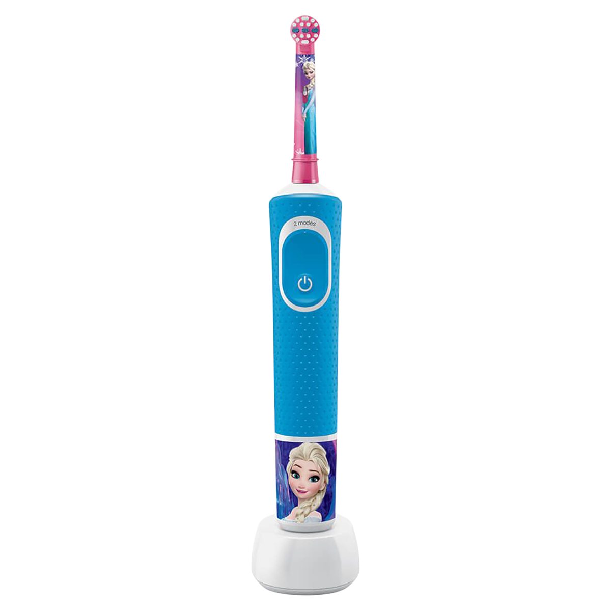 Яркий голубовато-розовый корпус украшен изображениями Анны и Эльзы, а в комплекте есть наклейки, чтобы ребенок мог персонализировать свою щетку. Такой дизайн мотивирует малыша с нетерпением ждать следующей чистки зубов.